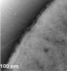 Čierne body na snímke povrchu baktérie sú nanočastice Ag, ktoré spôsobujú deformáciu a následnú degradáciu bunkovej membrány. Striebro má tendenciu reagovať so slabými Lewisovými zásadami typu R-S-R, R-SH, RS-, alebo PR3. Takže proteíny s obsahom síry, nachádzajúce sa v membráne (cysteín), alebo vo vnútri bunky (N-formylmetionín) sú zrejme preferenčnými miestami pre väzby strieborných nanočastíc. Vďaka kovalenčnej väzbe dochádza postupne k mechanickému pretrhnutiu bunkovej steny a baktéria hynie.