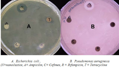 Príklad antibakteriálnej aktivity nanočastíc striebra (koncentrácia 50 ppm), stanovenej metódou Kirby-Bauer na papierových diskoch a porovnanie s inými antibiotikami. Táto metóda využíva disky s jednotlivými koncentráciami antimikrobiálnych látok a priemery zón korelujú s minimálnymi inhibičnými koncentráciami (MIC) (16).