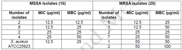 Z klinického prostredia pripravili izoláty zlatého stafylokoka (MSSA) a metycilín rezistentného zlatého stafylokoka (MRSA) a ako referenčnú vzorku použili S. aureus ATCC25923 a zisťovali hodnoty minimálnej inhibičnej (MIC) a bakteriocídnej (MBC) koncentrácie. Výsledky ukazujú, že na rôzne izoláty je efektivita pôsobenia koloidného striebra rôzna. Preto sa aj výsledky praktického použitia koloidného striebra u rovnakého druhu patogénu často odlišujú.