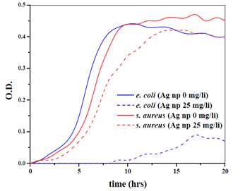 Z tohto dôvodu potom autori práce (36) mohli určiť nasledovné rastové krivky E. coli a S. aureus (rozmer nanočastíc 10 - 15 nm) :