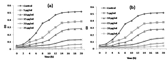 Dynamická rastová krivka S. aureus ATCC 25923 (a) a MRSA (b) v prítomnosti rôznych koncentrácií koloidného striebra. (MRSA-methycillín-rezistentný S. aureus ; μg/ml = ppm) podľa autorov (19).